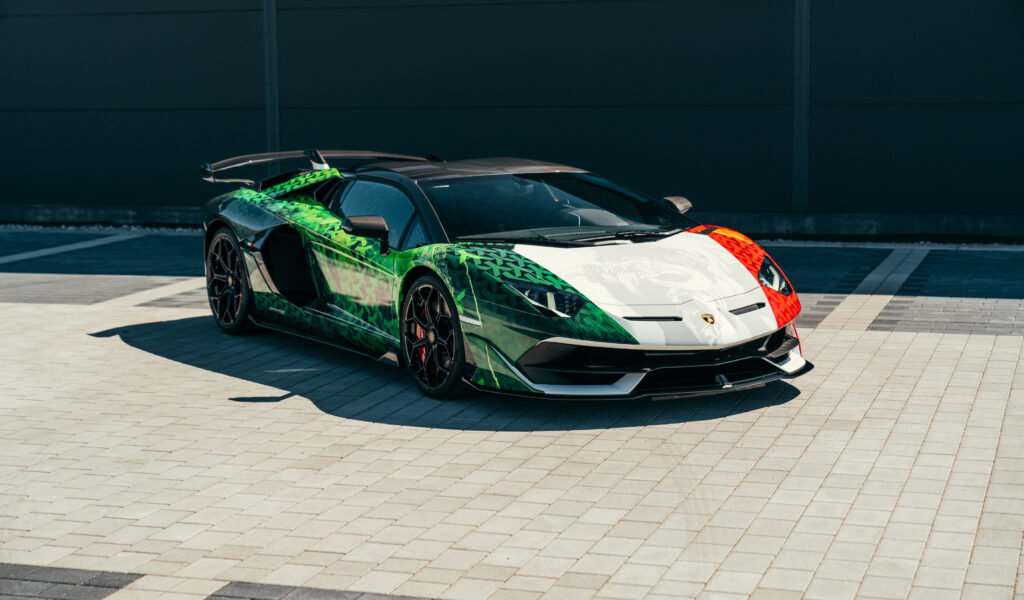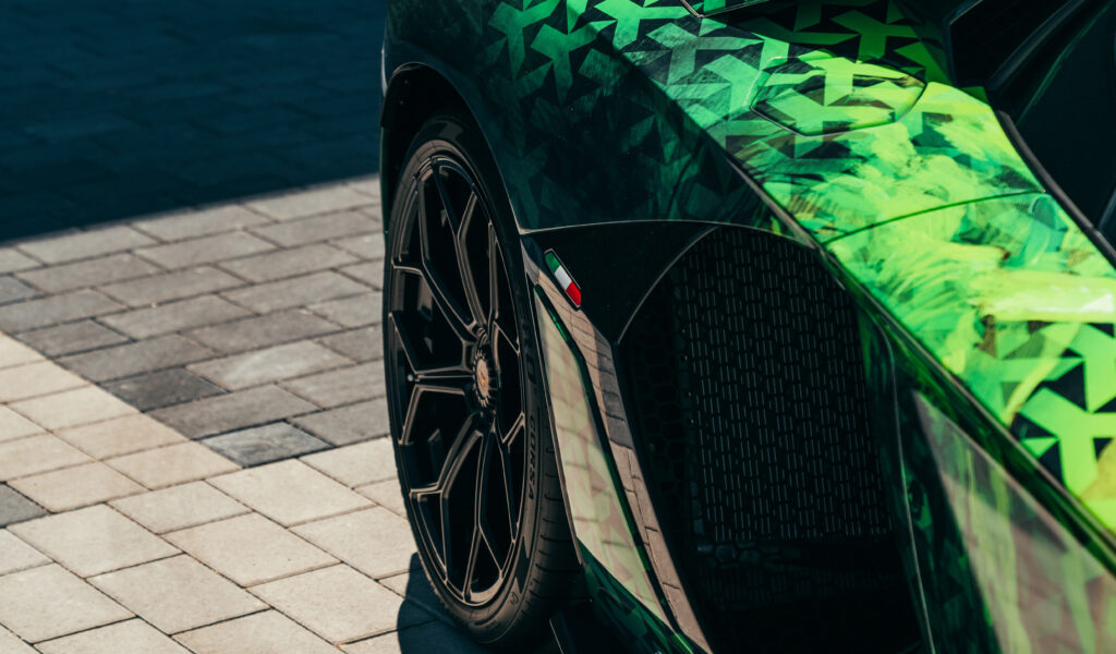 A vehicle wrap for a Lamborghini, designed by the renowned artist Timo Wuerz, transforms the supercar into a vibrant tribute to Italy with a colorful design inspired by the Italian flag. This artistic wrap elegantly blends the bold green, white, and red colors of the flag, celebrating the car’s heritage with a creative and modern twist.