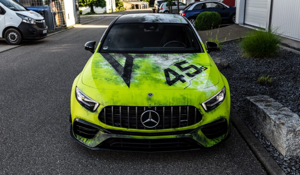 Das Fahrzeug wurde im Videospiel Forza Horizon 4 von unserem Designer “StuiiDesign” entworfen, digitalisiert und umgesetzt auf einer AMG A45s, inkl. Tieferlegung durch KW Variante 3 und Barracuda Wheels. Eine komplette Videodokumentation des Projekts ist auf Youtube zu finden. Gedruckt wurde auf Avery Dennison MPI 1105 mit Mattem Laminat – dieses wurde Vollflächig verklebt.